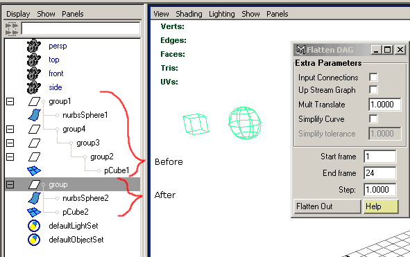 Flatten DAG (bake under parent): Bake animation under parent. Scrips works with selection. It scans selection for all transforms that has a shape. So you can select the top of hierarchy to bake every transform, that has a shape. Or select only exact objects to bake.